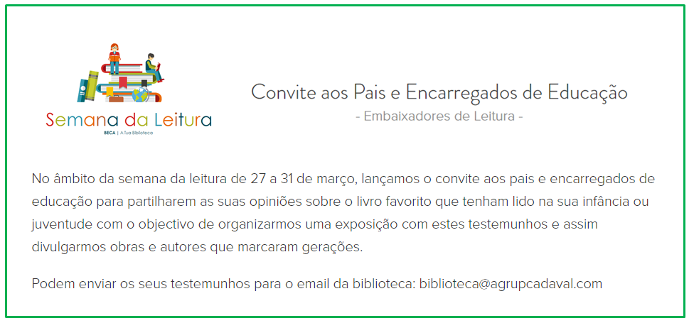 A tua Biblioteca vai organizar a "Semana da Leitura" que decorre no dia 20 a 31 de março de 2017. Abaixo consulta o cartaz e os convites: